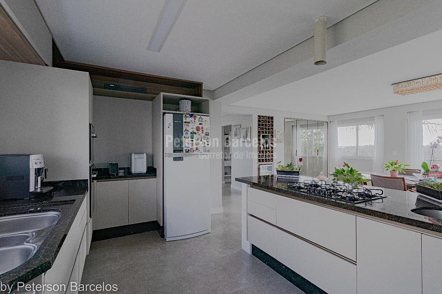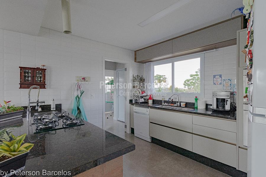 A cozinha é equipada com armários e balcão e possui acesso à despensa e conexão com a lavanderia, que conta com acesso de serviço e área de apoio externa.
