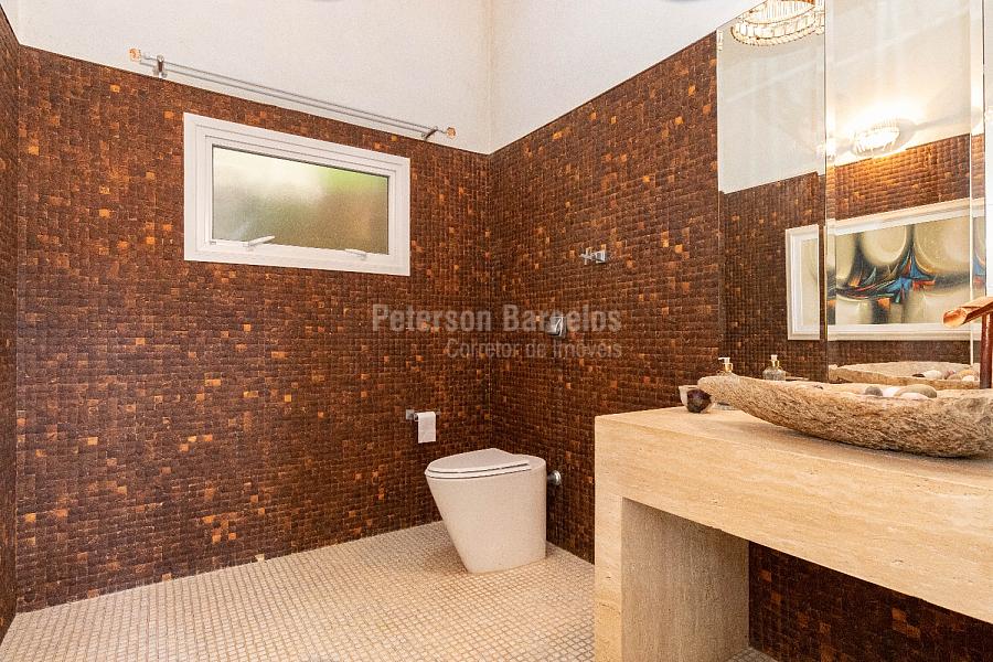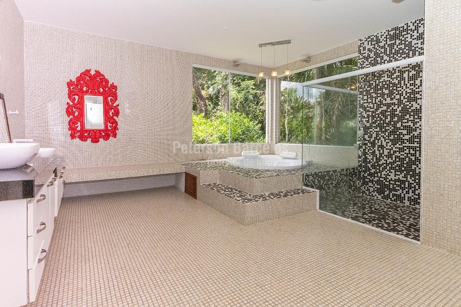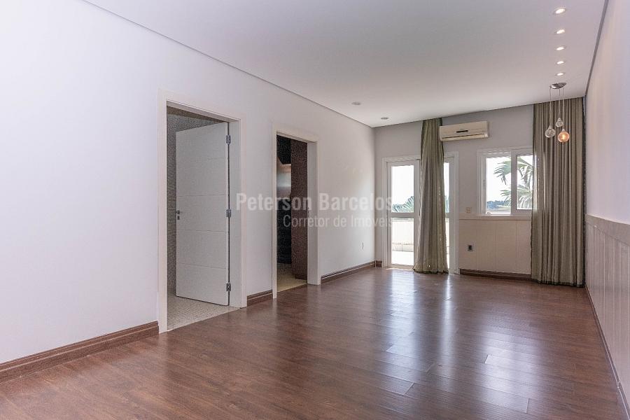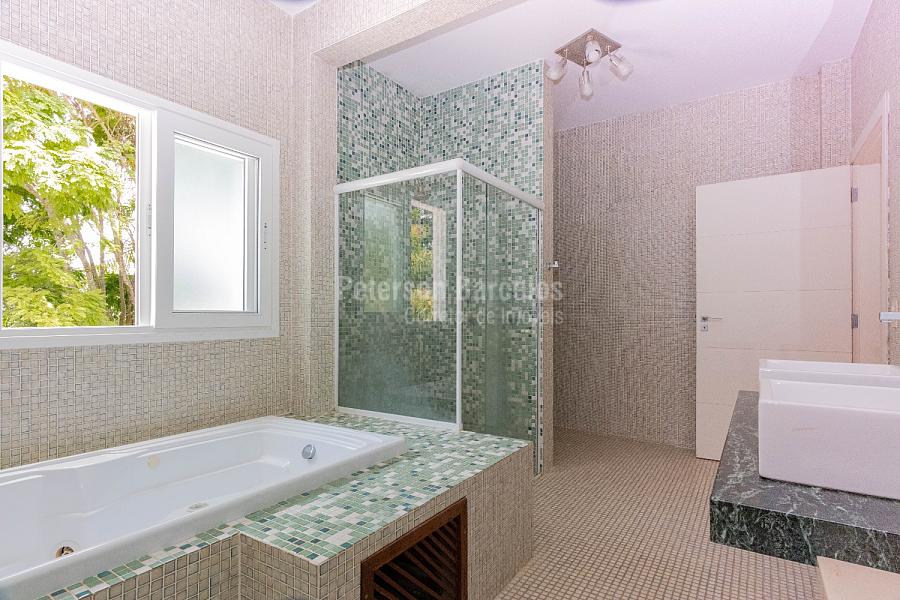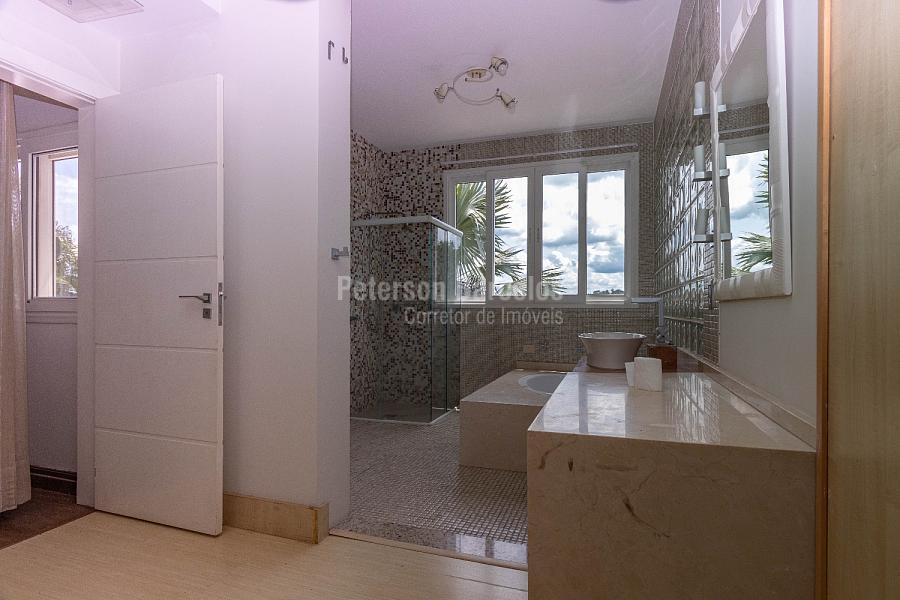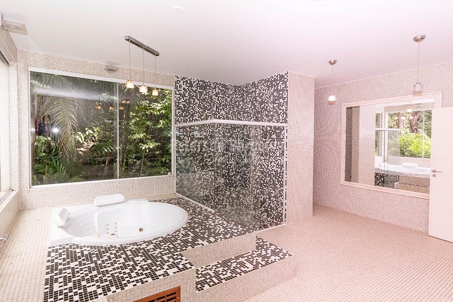 No andar superior ficam posicionadas as 4 suítes do imóvel, sendo 1 suíte máster com closet sr. e sra., sala de banho com hidro, lareira, terraço exclusivo e espaço fitness. Possui ainda 2 demi-suítes e 1 suíte, todas com hidro, closet e integradas por varanda.