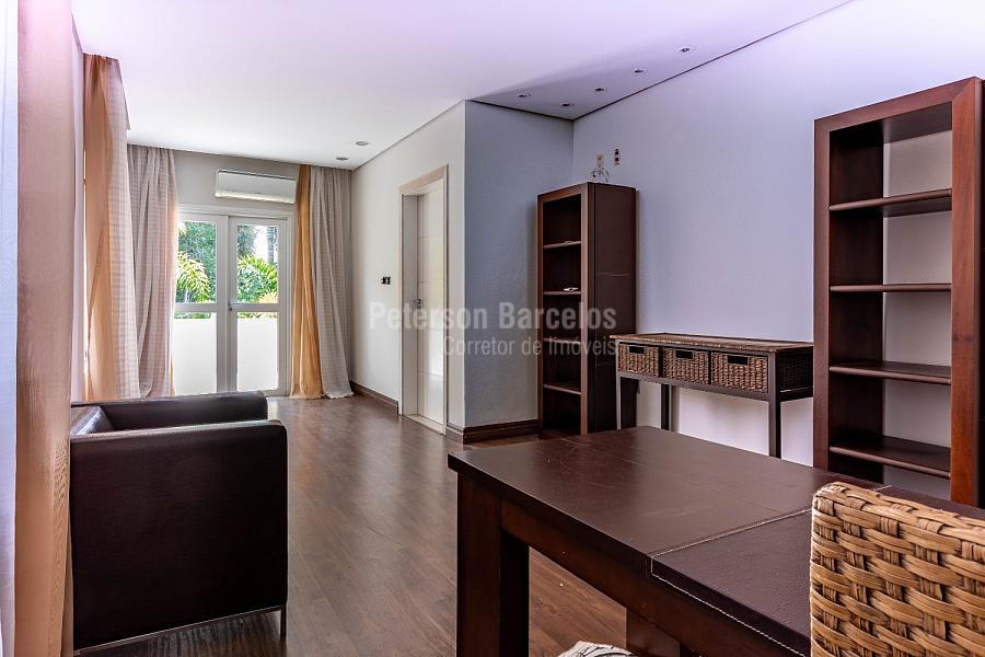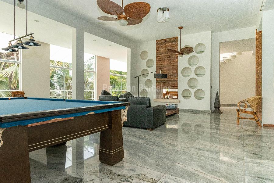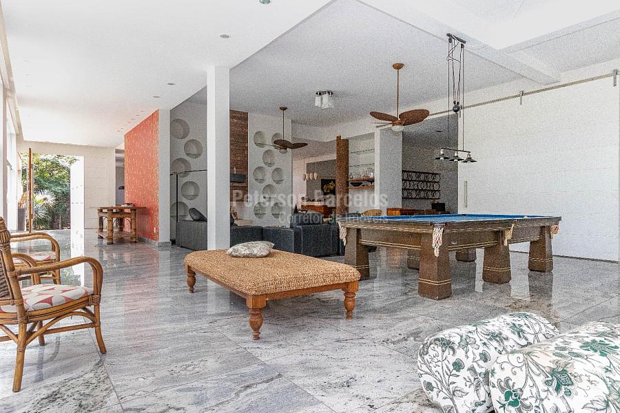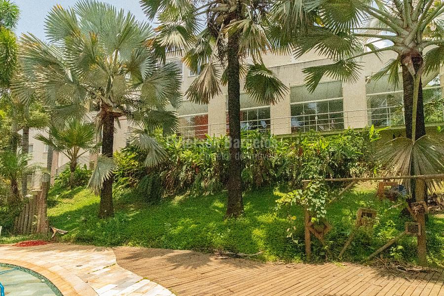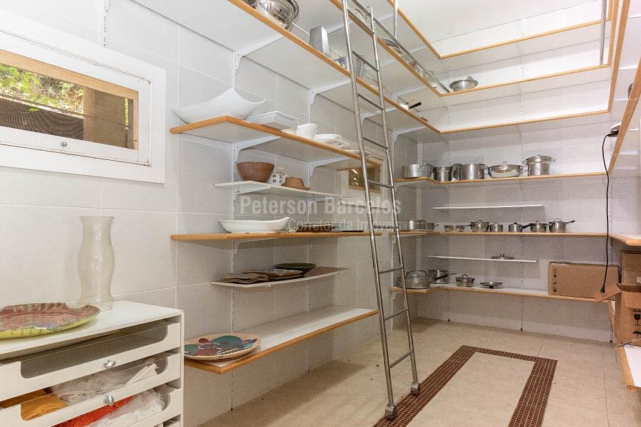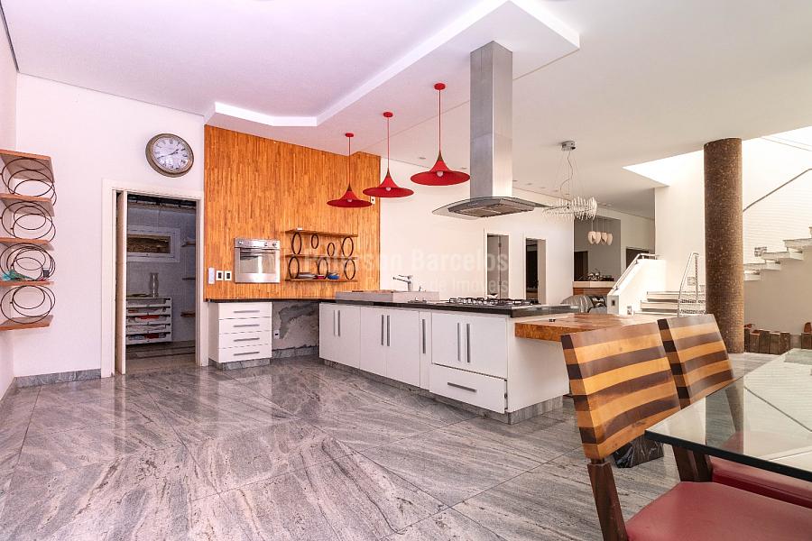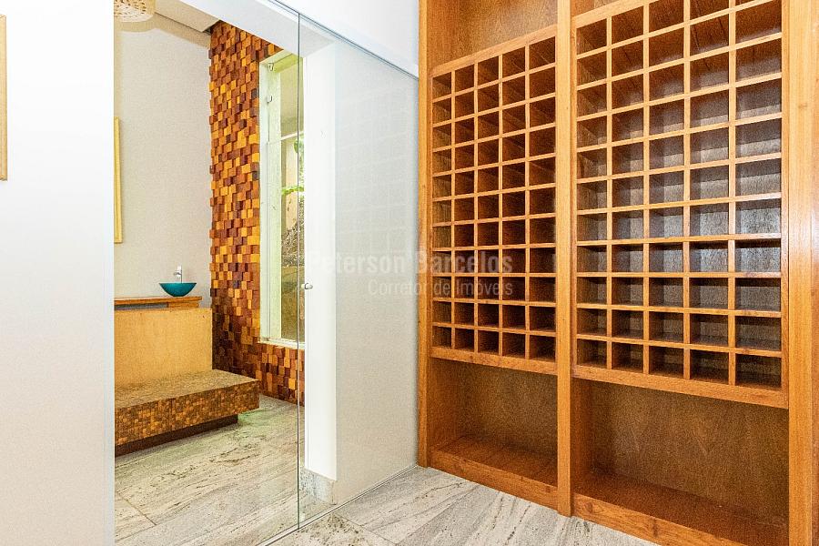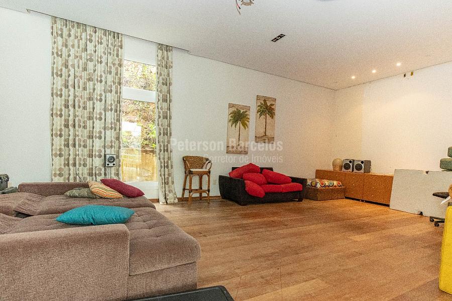 No andar térreo, o hall de entrada, orienta o visitante à sala de estar (ponto alto para a elegante lareira) e que está integrada com a sala de jogos, o terraço com jardim e também conectada com a varanda lateral. A sala de cinema é devidamente reservada e o bar disponível conta com uma adega climatizada para 110 rótulos.