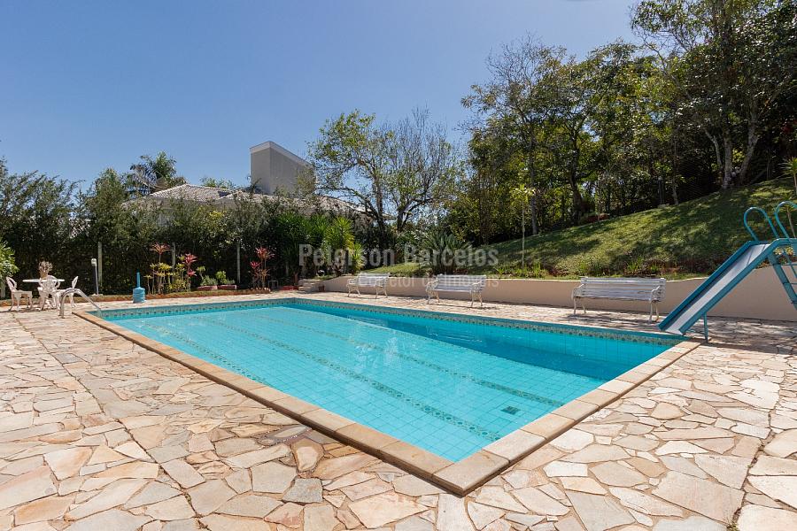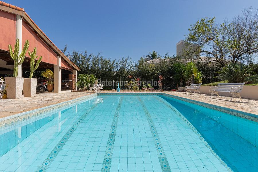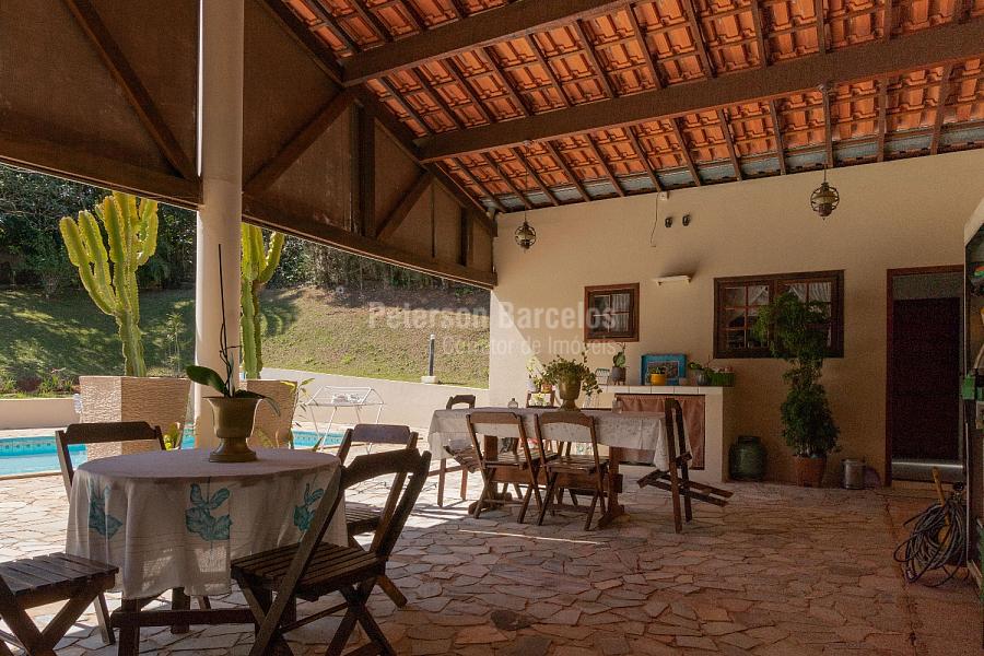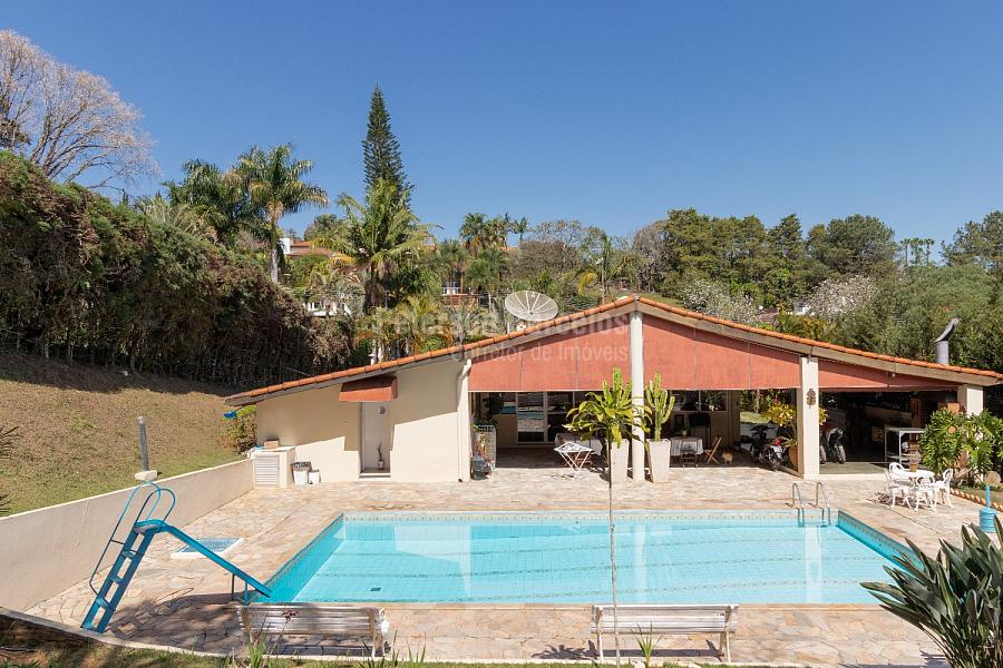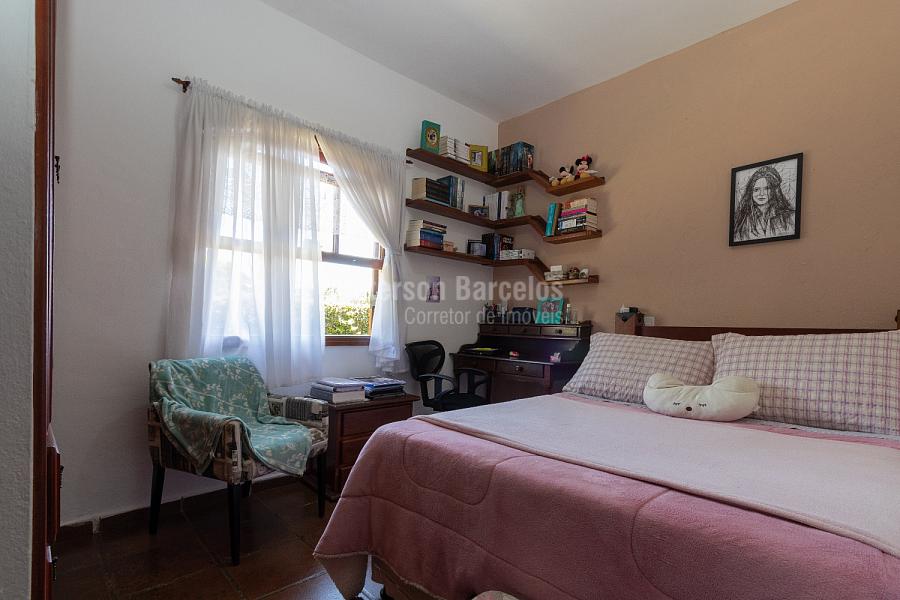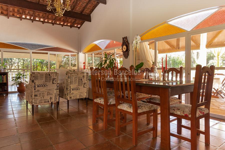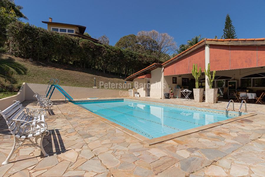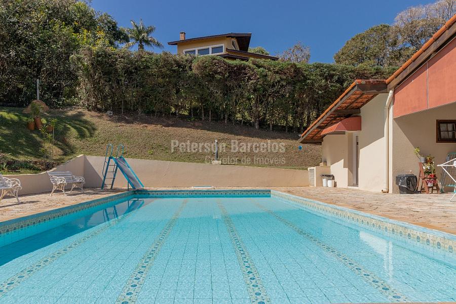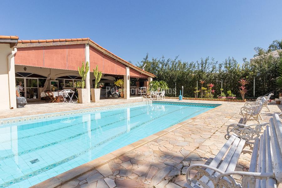 São 5 dormitórios, 1 suíte, sala de estar, em dois ambientes, sala de tv e jantar, cozinha, varanda com churrasqueira, piscina em alvenaria medindo 5x10m com profundidade entre 0,5 e 1,5m.