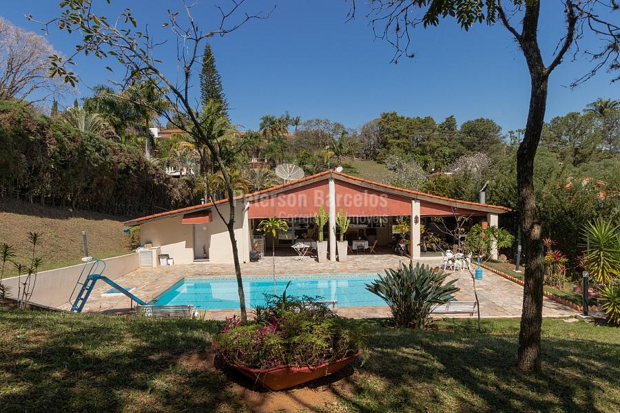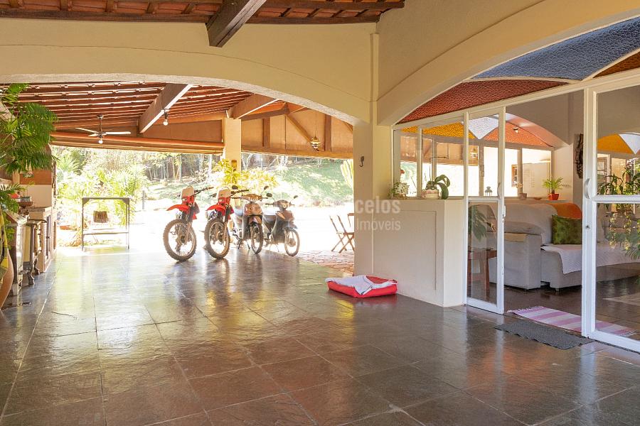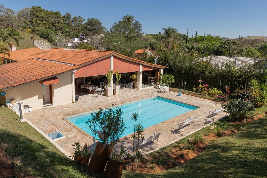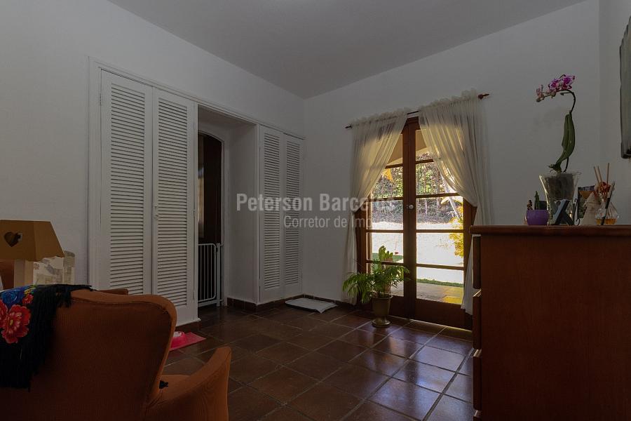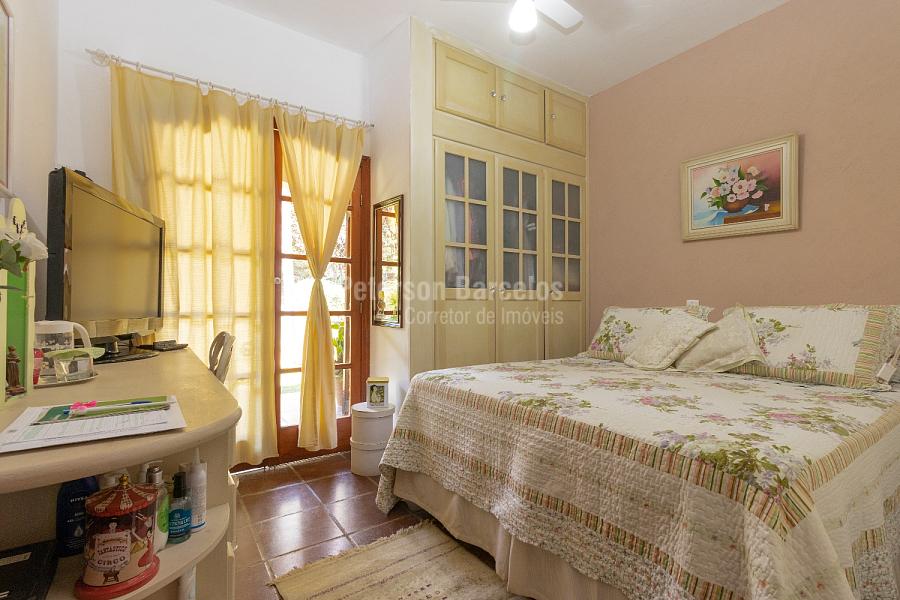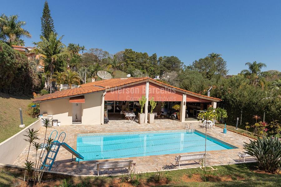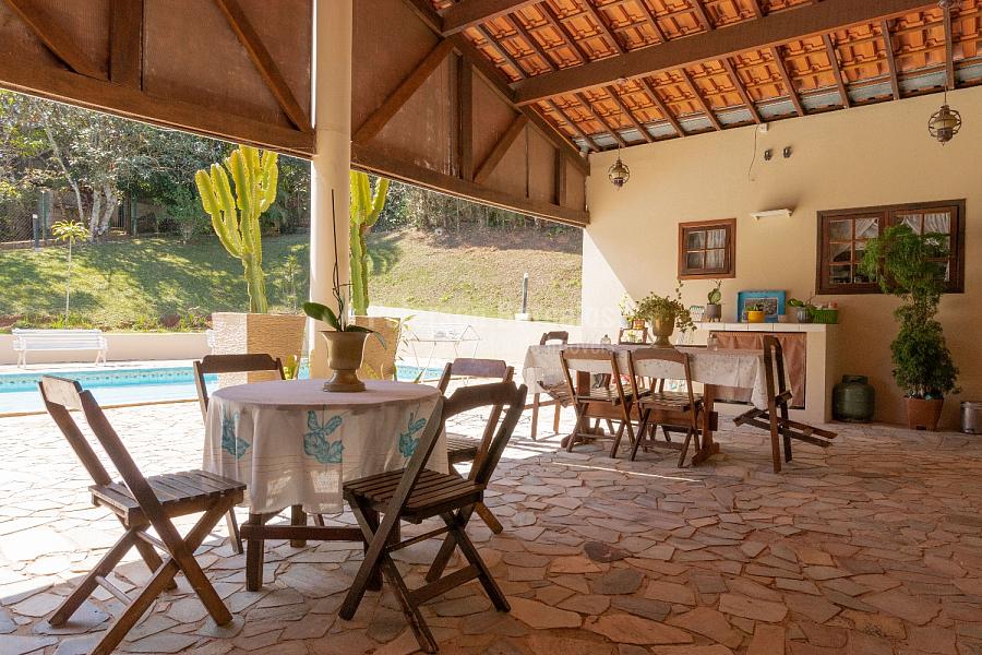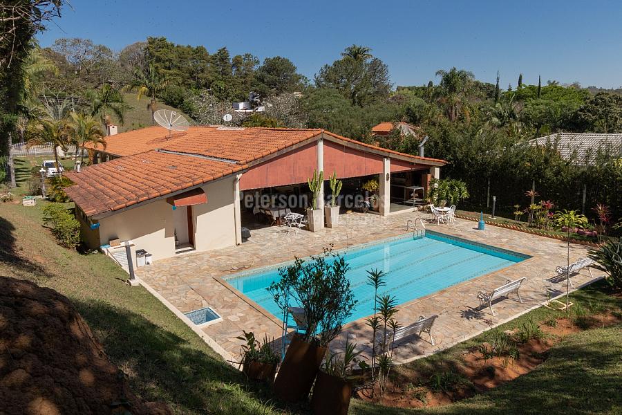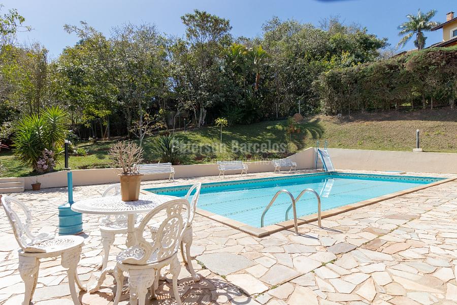 São 5 dormitórios, 1 suíte, sala de estar, em dois ambientes, sala de tv e jantar, cozinha, varanda com churrasqueira, piscina em alvenaria medindo 5x10m com profundidade entre 0,5 e 1,5m.