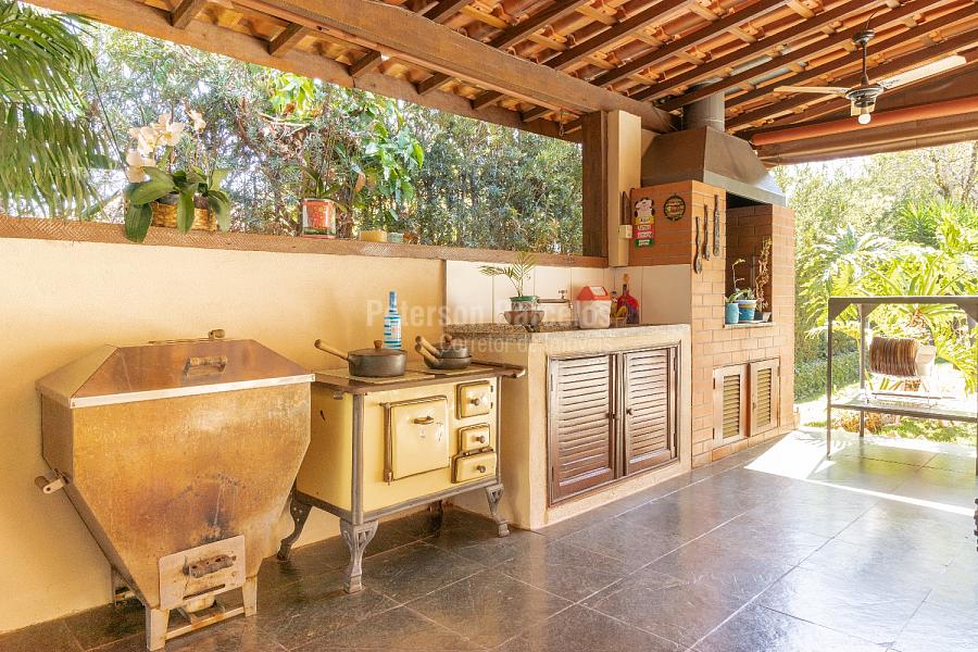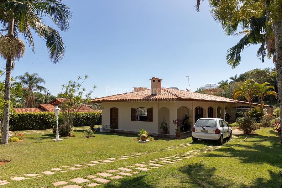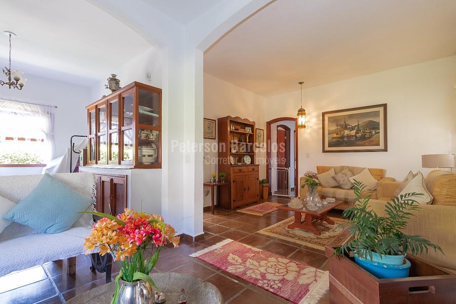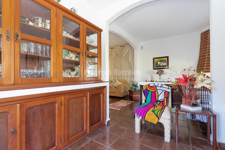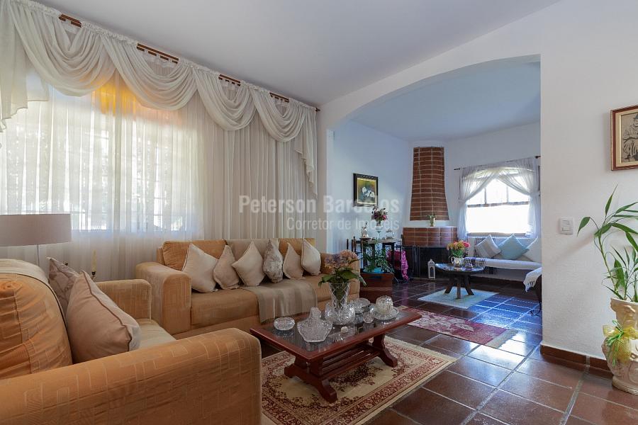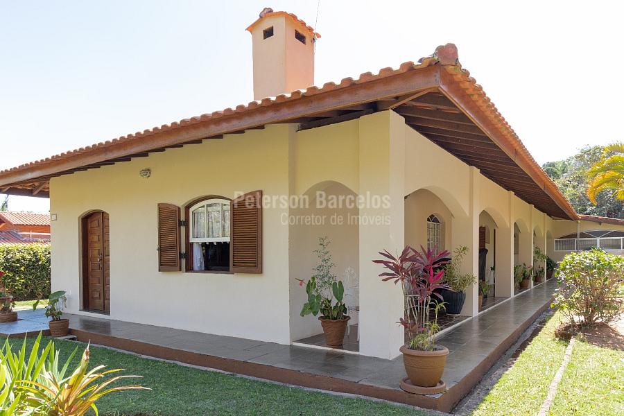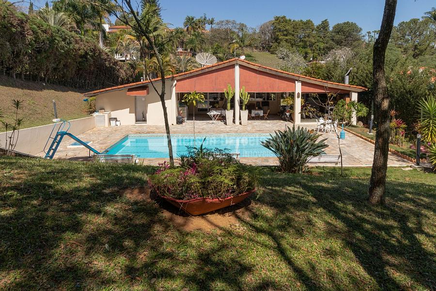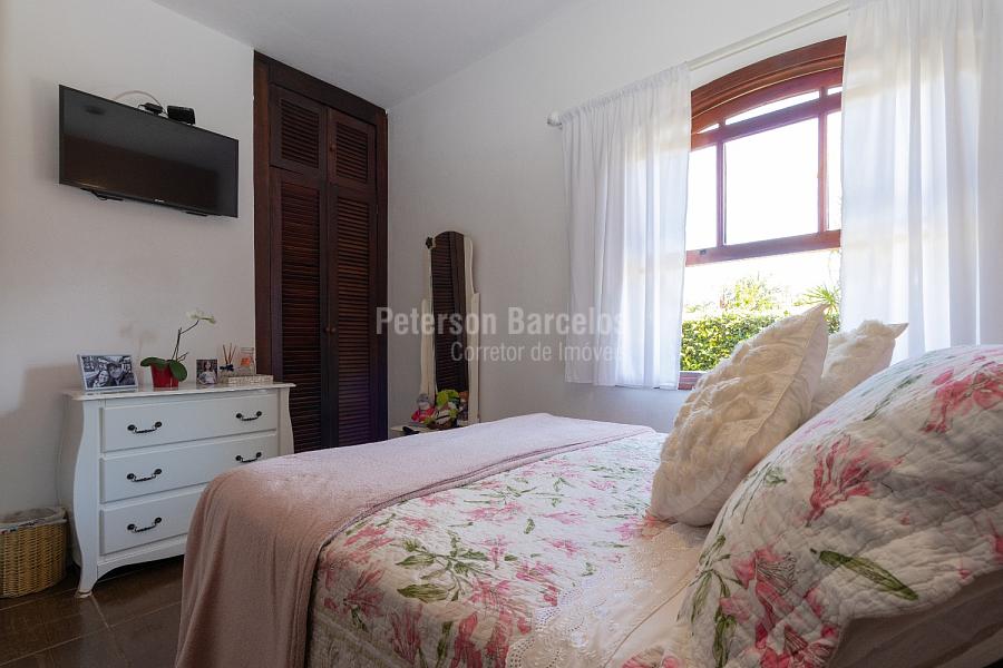São 5 dormitórios, 1 suíte, sala de estar, em dois ambientes, sala de tv e jantar, cozinha, varanda com churrasqueira, piscina em alvenaria medindo 5x10m com profundidade entre 0,5 e 1,5m.