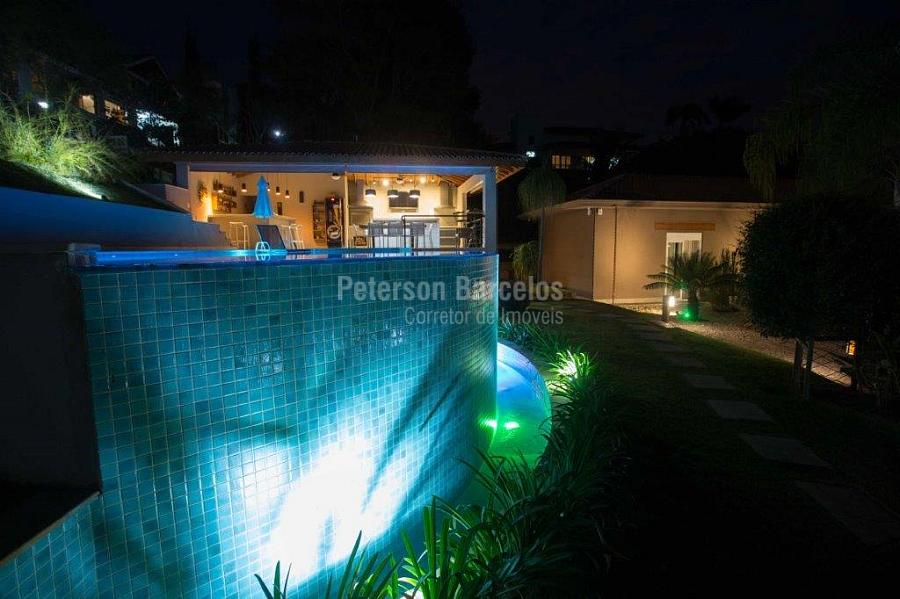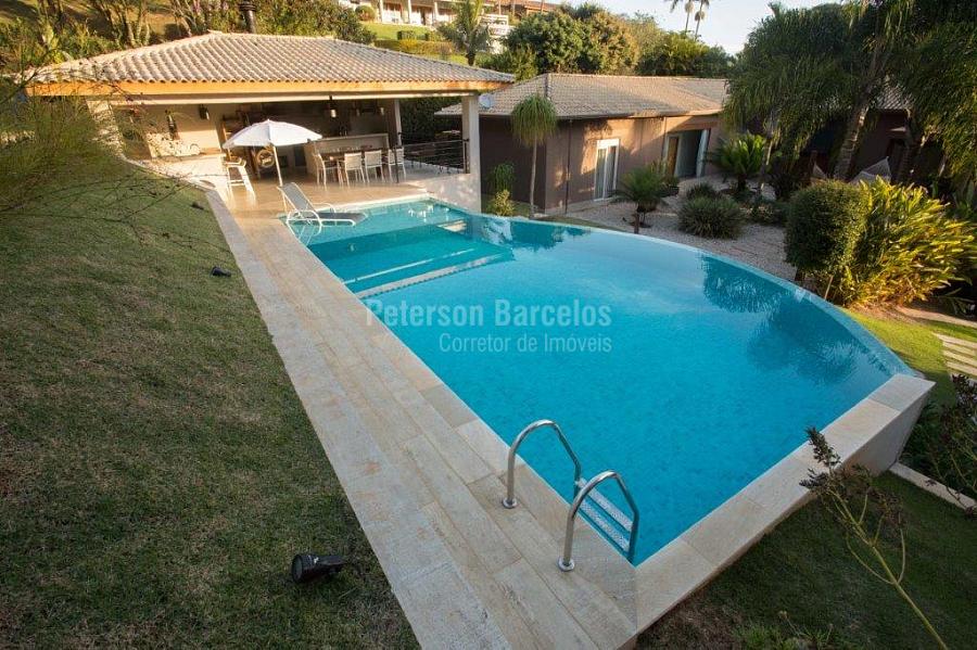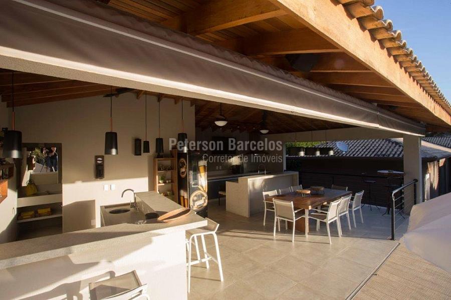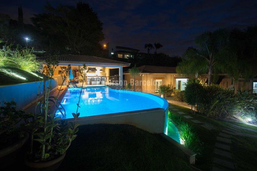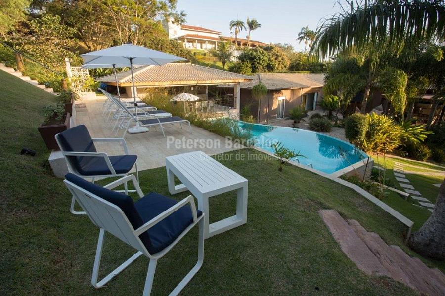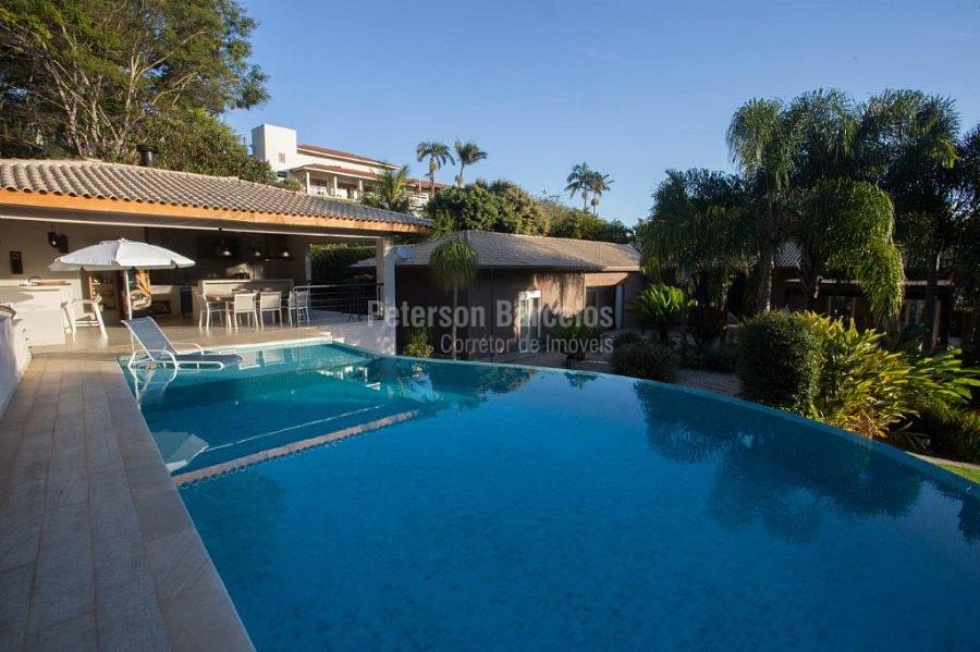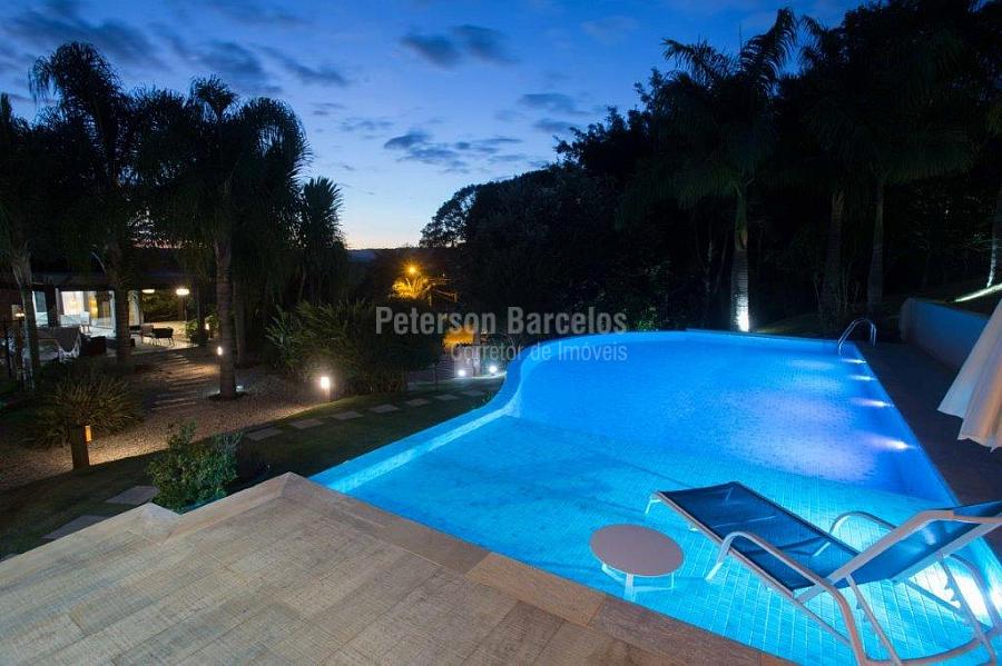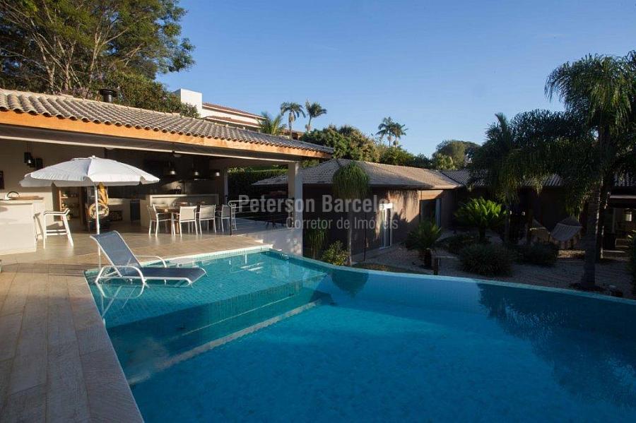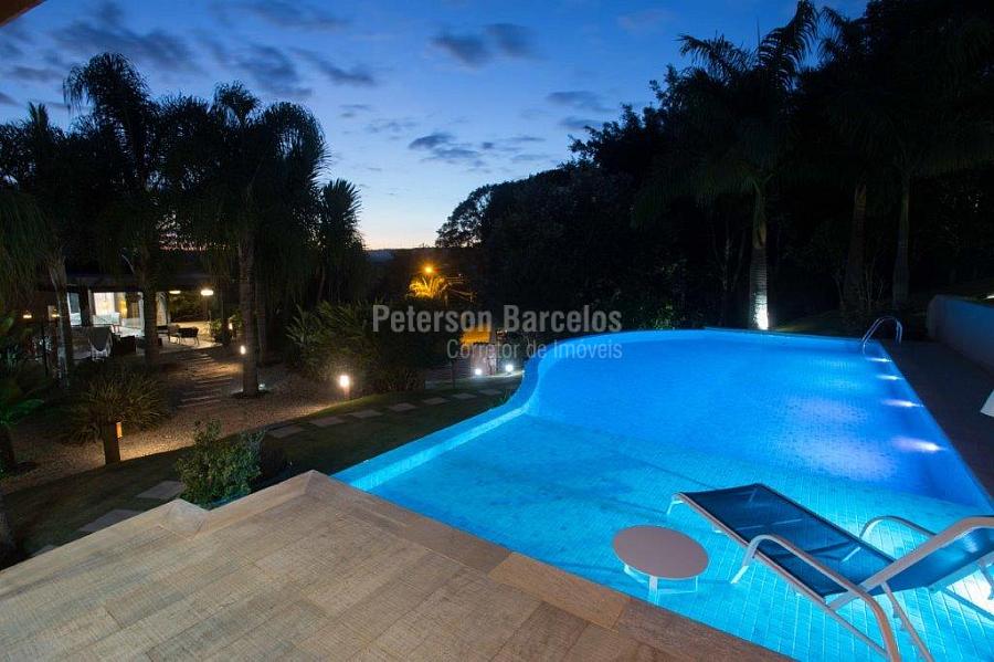 A precisão do moderno e funcional projeto entrega uma residência térrea, contendo: 5 suítes na casa principal, cozinha planejada com armários embutidos e integrada com sala de jantar e “home Theater”, área gourmet completa e equipada com armários, cooktop e bar, piscina com borda infinita e trocador de calor, Lounge completo com lareira e jogos, e uma vista panorâmica admirável. No Lounge ainda existe mais uma suíte.