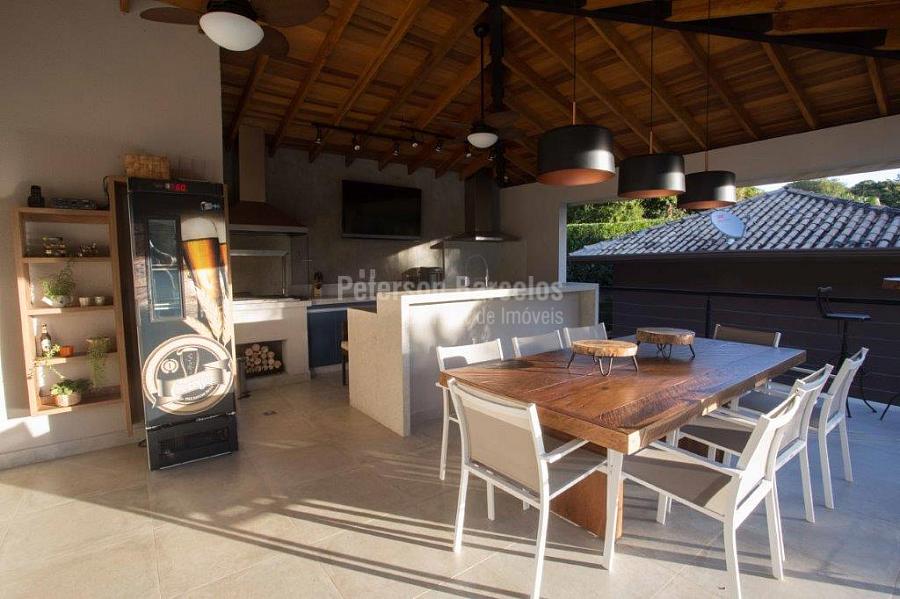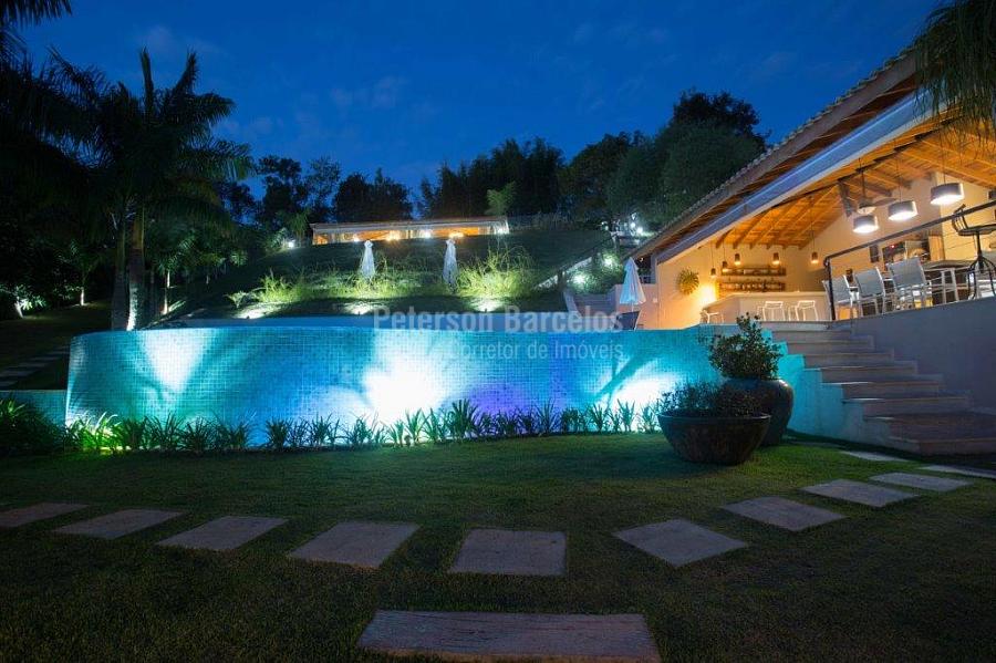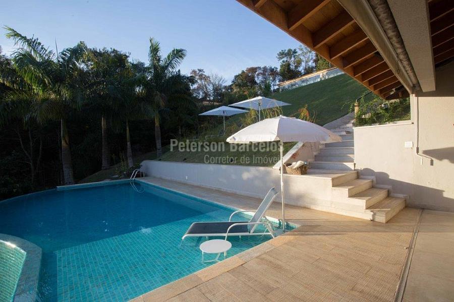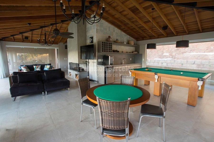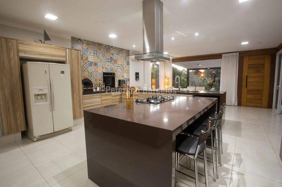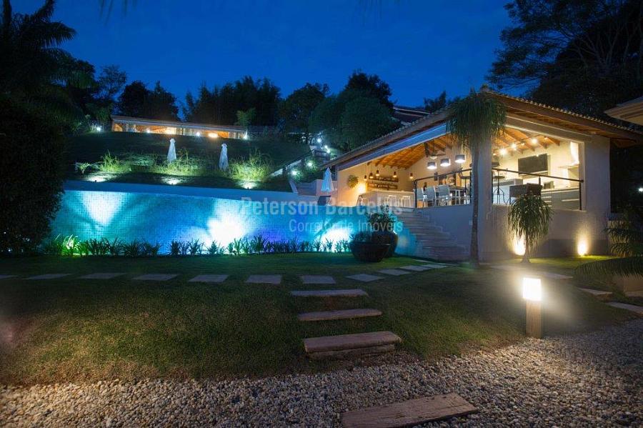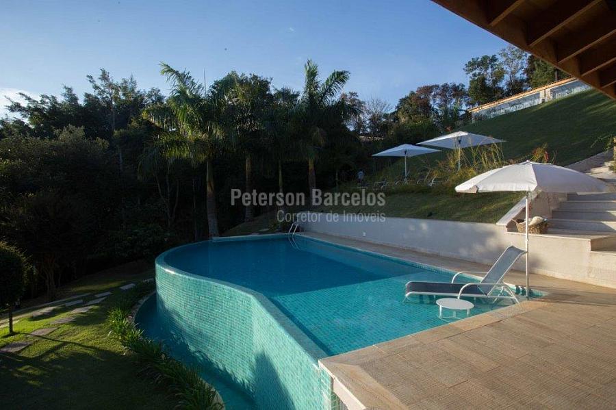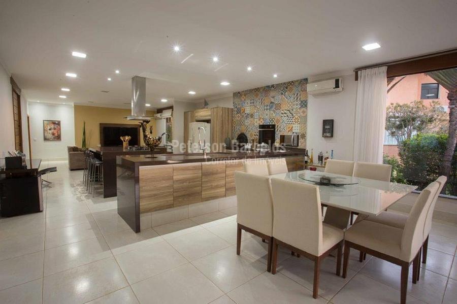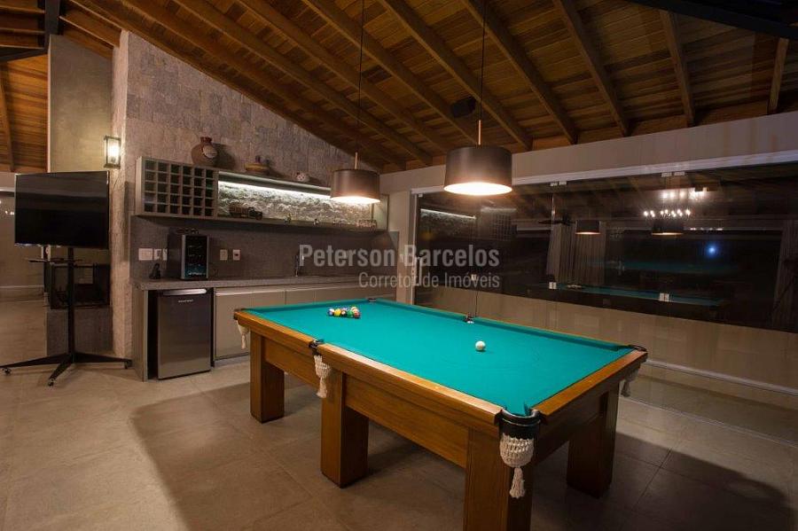 A precisão do moderno e funcional projeto entrega uma residência térrea, contendo: 5 suítes na casa principal, cozinha planejada com armários embutidos e integrada com sala de jantar e “home Theater”, área gourmet completa e equipada com armários, cooktop e bar, piscina com borda infinita e trocador de calor, Lounge completo com lareira e jogos, e uma vista panorâmica admirável. No Lounge ainda existe mais uma suíte.