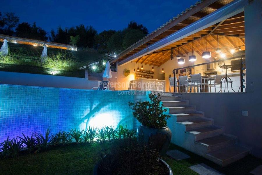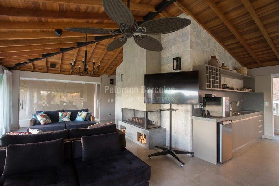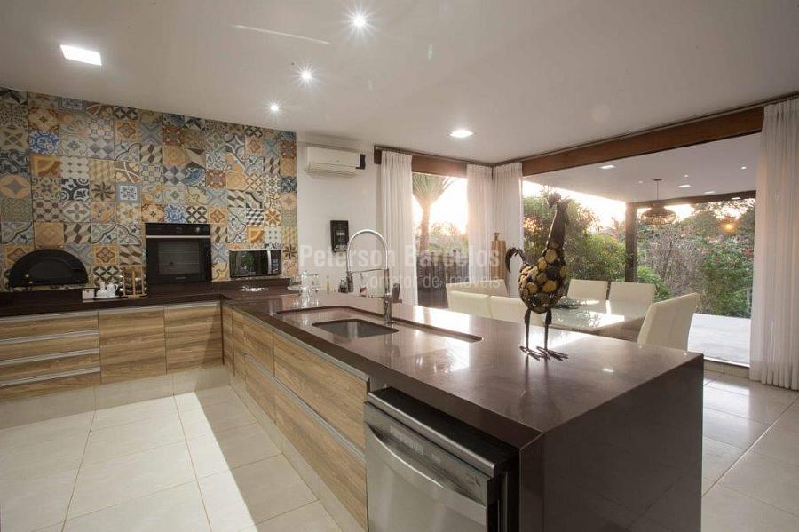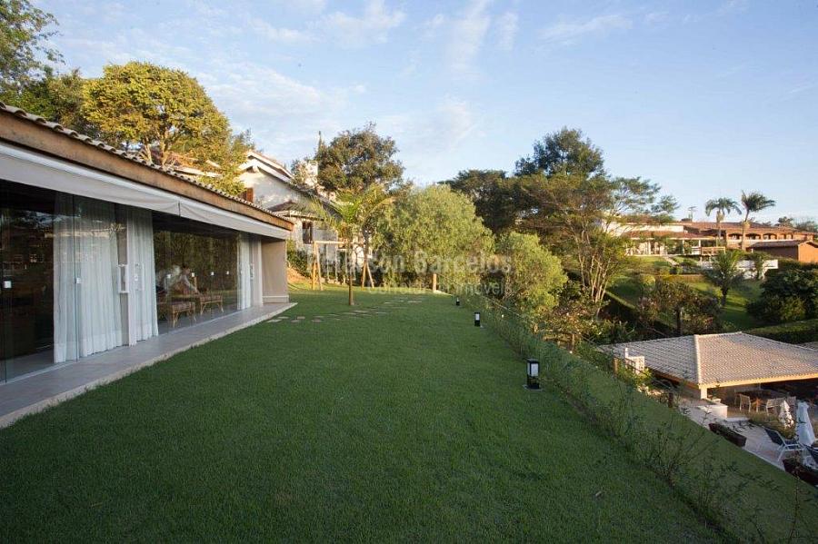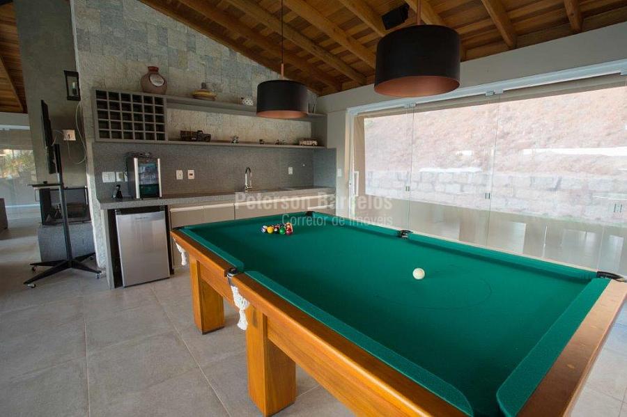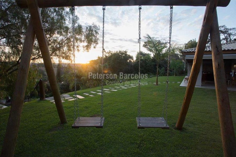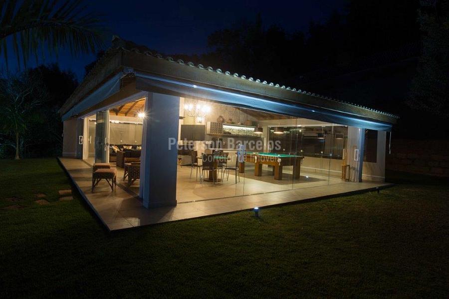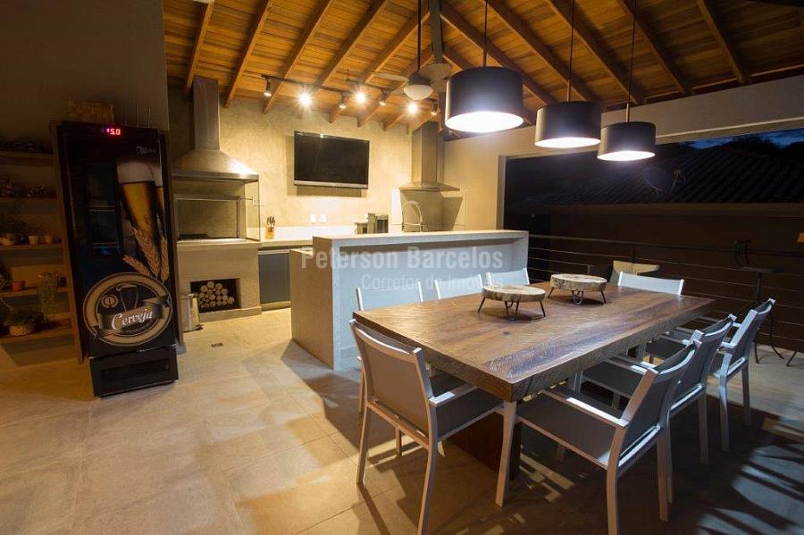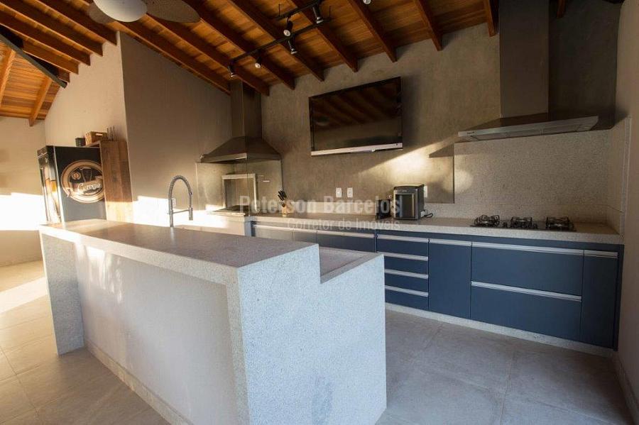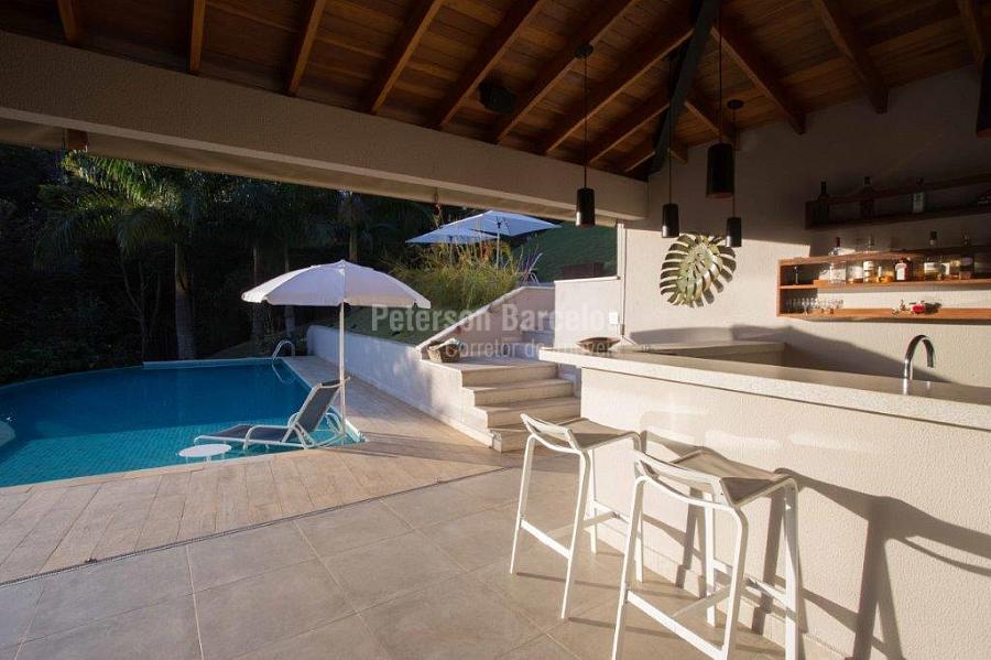 A precisão do moderno e funcional projeto entrega uma residência térrea, contendo: 5 suítes na casa principal, cozinha planejada com armários embutidos e integrada com sala de jantar e “home Theater”, área gourmet completa e equipada com armários, cooktop e bar, piscina com borda infinita e trocador de calor, Lounge completo com lareira e jogos, e uma vista panorâmica admirável. No Lounge ainda existe mais uma suíte.