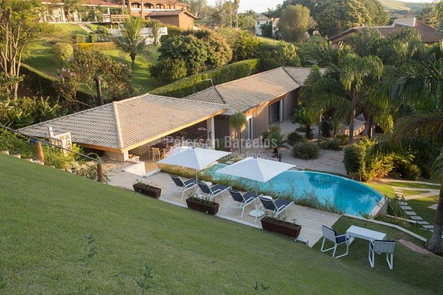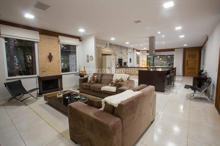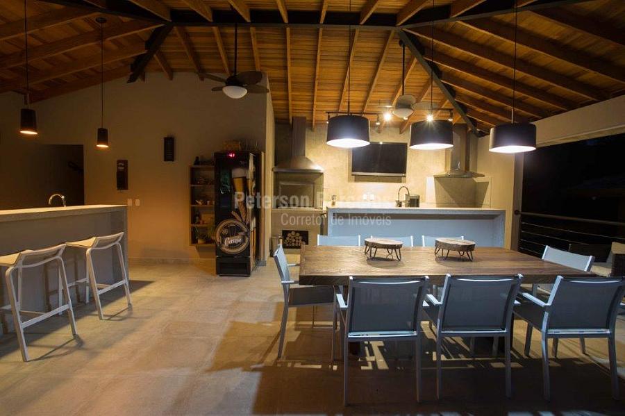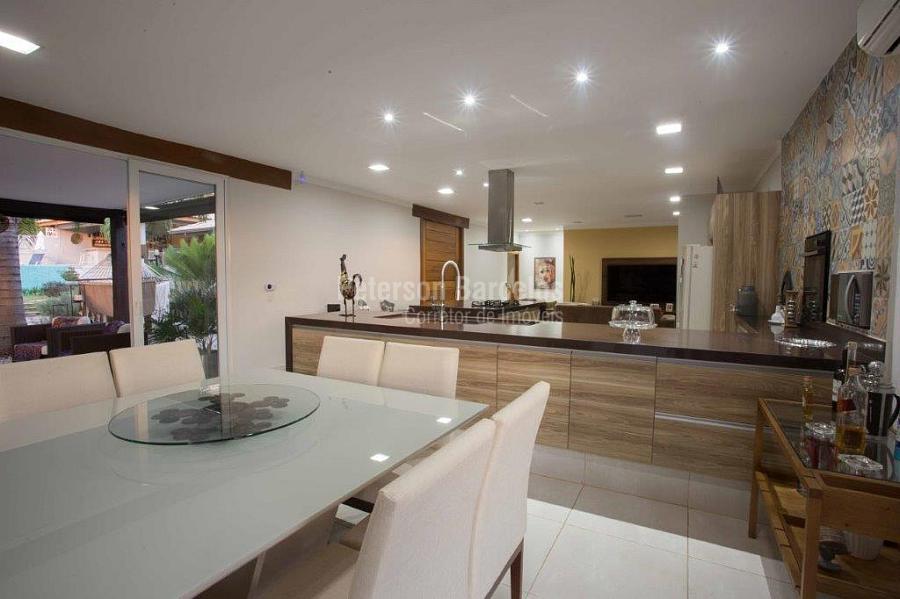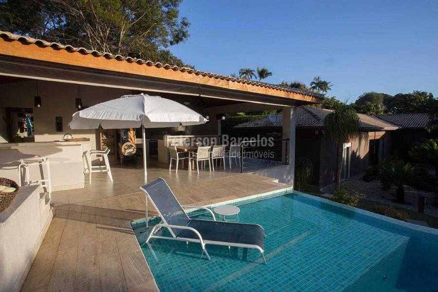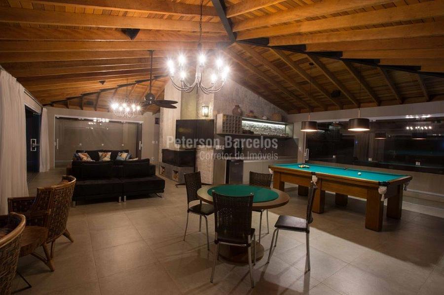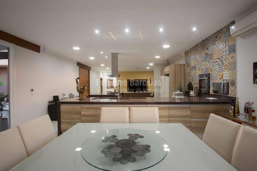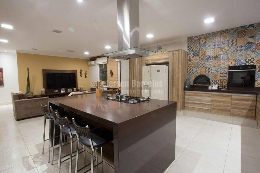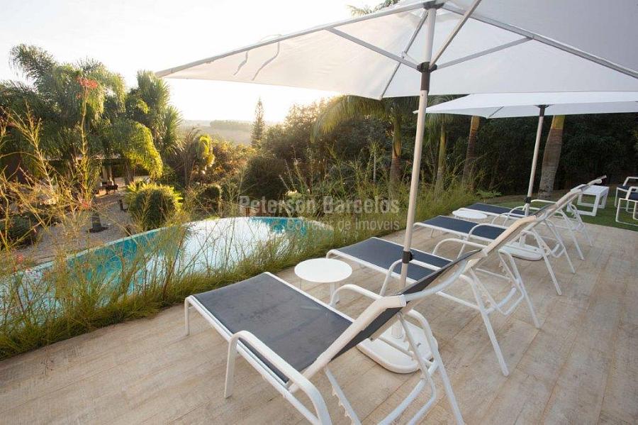 A precisão do moderno e funcional projeto entrega uma residência térrea, contendo: 5 suítes na casa principal, cozinha planejada com armários embutidos e integrada com sala de jantar e “home Theater”, área gourmet completa e equipada com armários, cooktop e bar, piscina com borda infinita e trocador de calor, Lounge completo com lareira e jogos, e uma vista panorâmica admirável. No Lounge ainda existe mais uma suíte.