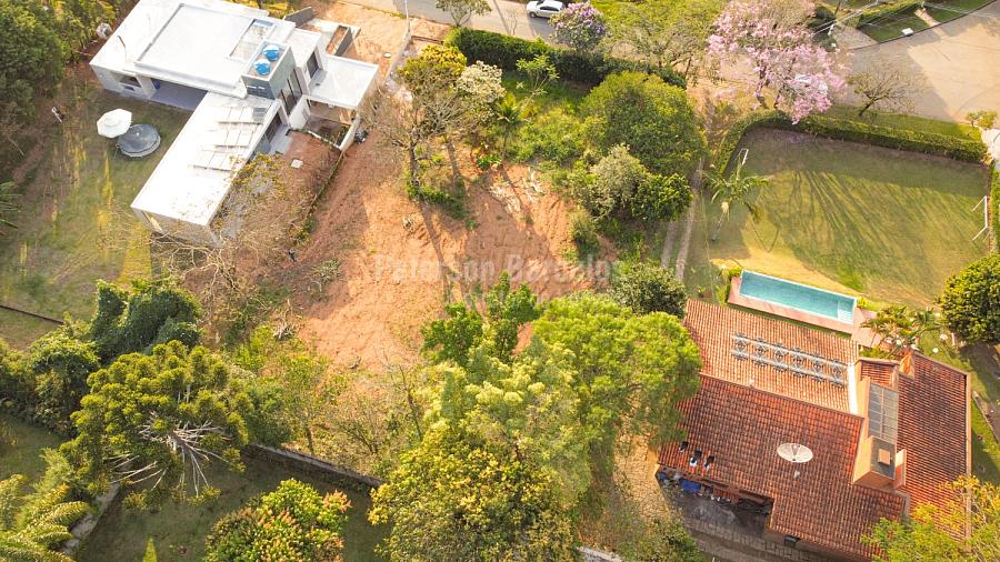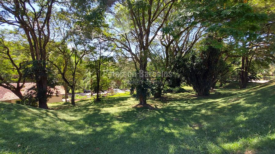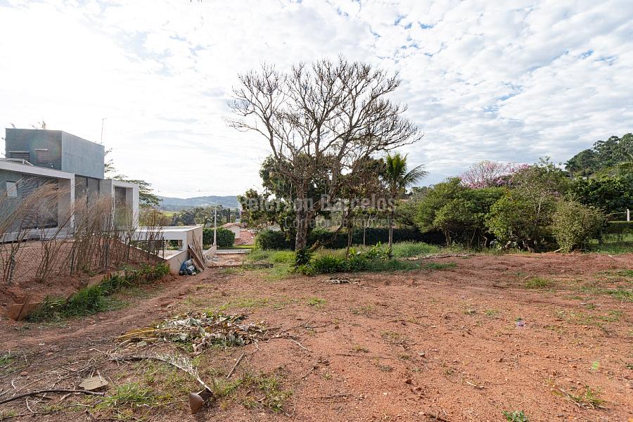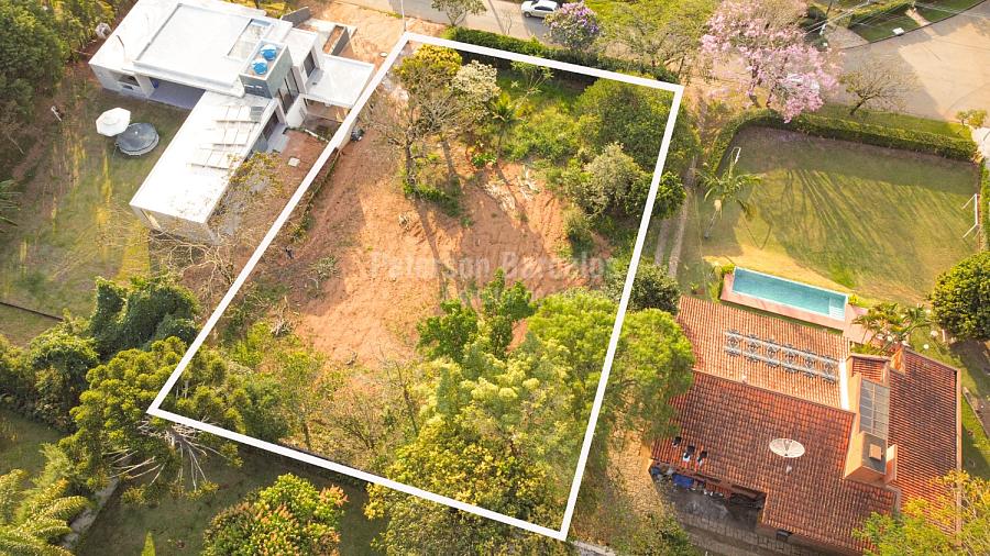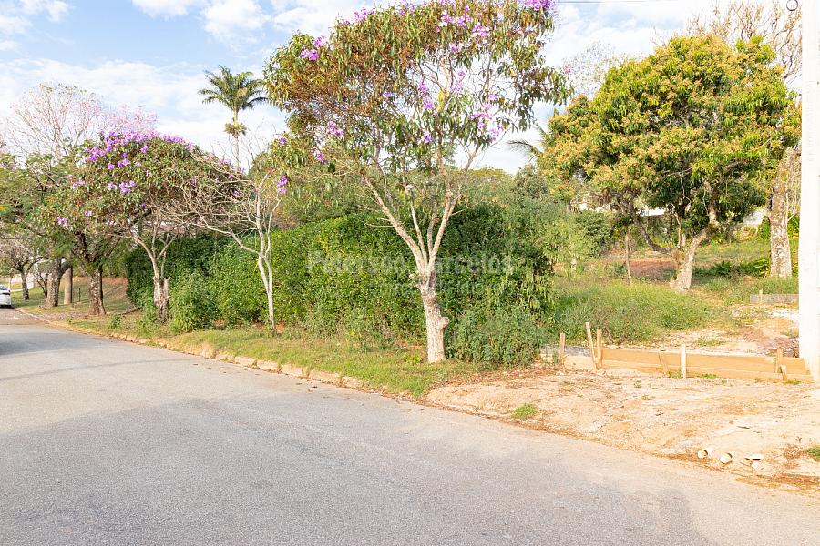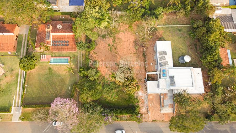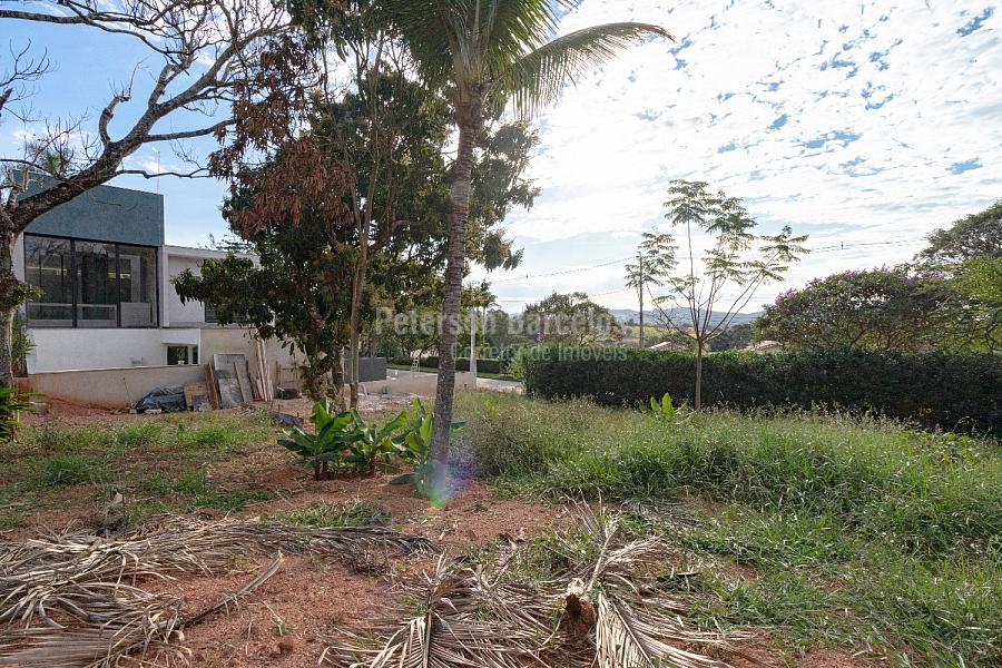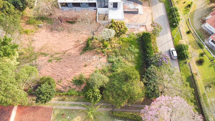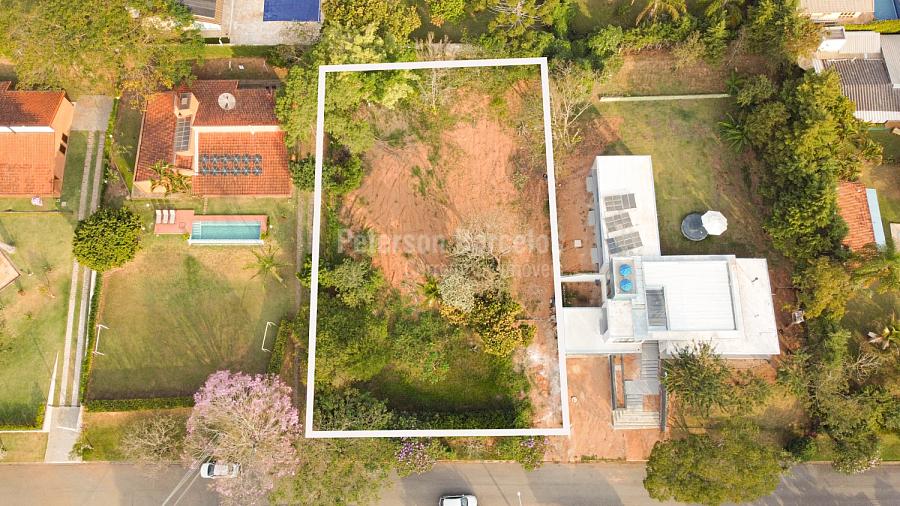 Terreno em leve aclive nos fundos, medindo 30m de frente e fundos e 50m em ambas laterais. Localização central do condomínio e com construções finalizadas em todos os limites do lote.