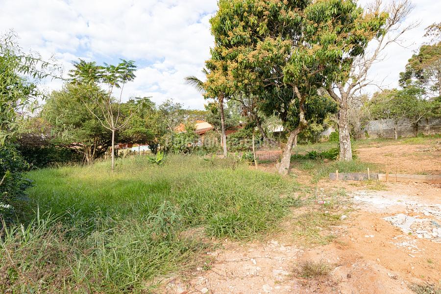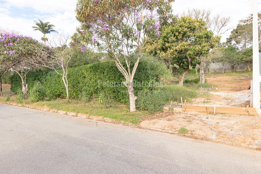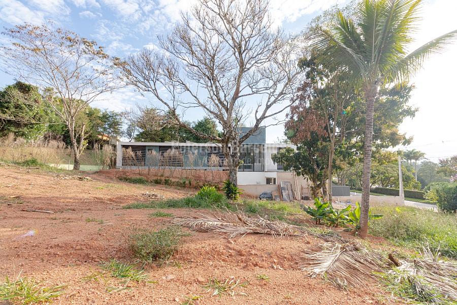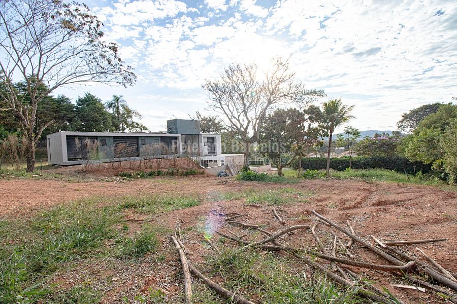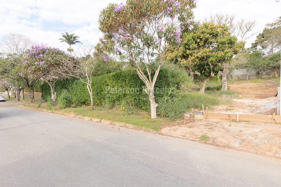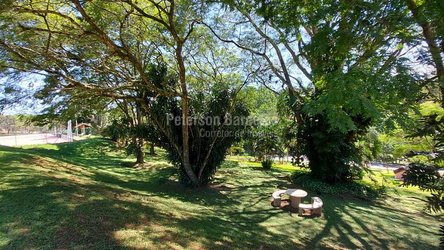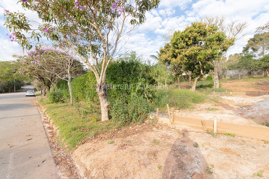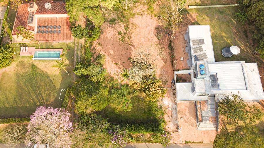 Terreno em leve aclive nos fundos, medindo 30m de frente e fundos e 50m em ambas laterais. Localização central do condomínio e com construções finalizadas em todos os limites do lote.